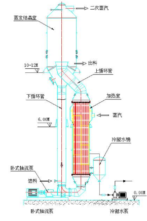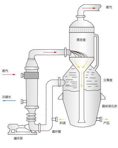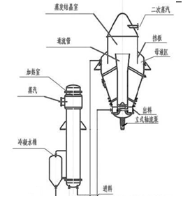 The FC separator consists of a conical bottom (with salt leg improvement).The fluid is discharged from the bottom, and is sent to the heat exchanger by the circulation pump. After heating, the fluid enters the separator for evaporation through the bulk port.In this case, the FC crystallizer belongs to the crystal slurry circulation type.