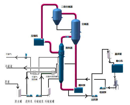 The MVR forced circulation evaporator consists of heater, separator, and forced circulation pump. The material is heated by the steam outside the heat exchange, and rises to the separator under the action of the circulation pump. The secondary steam overflows from the material, the material is concentrated to reach supersaturation thus make the crystal grow.The desaturated material move into the forced circulation pump. Under the action of the circulation pump,the material enters the heat exchanger. The material is continuously evaporation-concentration or concentration-crystallization. The secondary steam in the crystal evaporating separator is purified by the separation and defoaming device in the upper part of the evaporating separator and sent to the compressor. The compressor compresses the secondary vapor and sends it to the heat exchanger shell for the evaporation heat source,so as to achieve a continuous evaporation process.